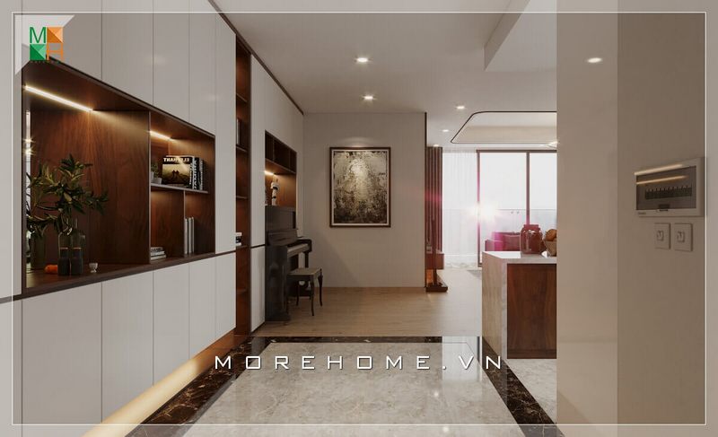 Màu trắng nổi bật khi được kết hợp với các màu khác đã tạo nên màu chủ đạo cho phòng khách và toàn bộ căn hộ, giúp tạo nên một bức tranh thanh lịch, nhẹ nhàng và tinh tế.